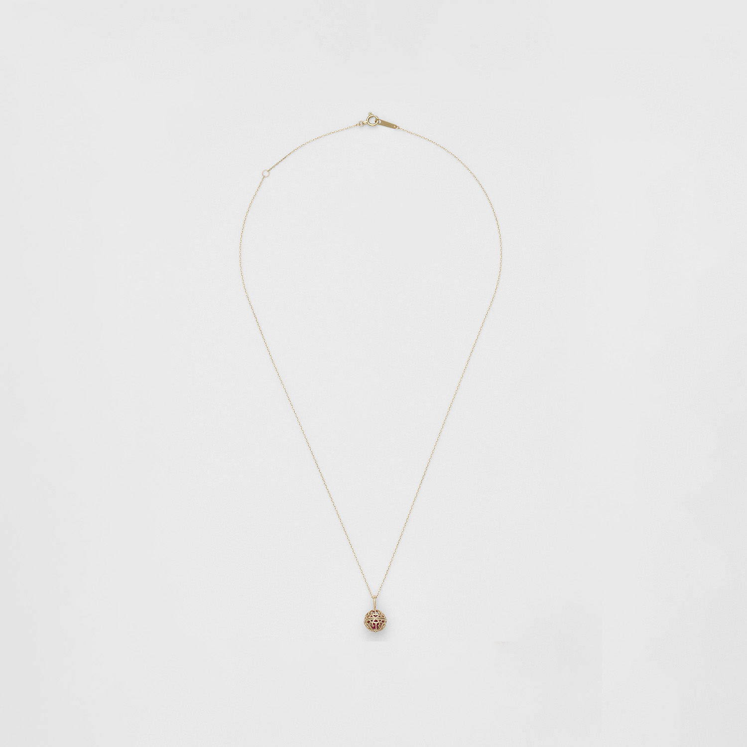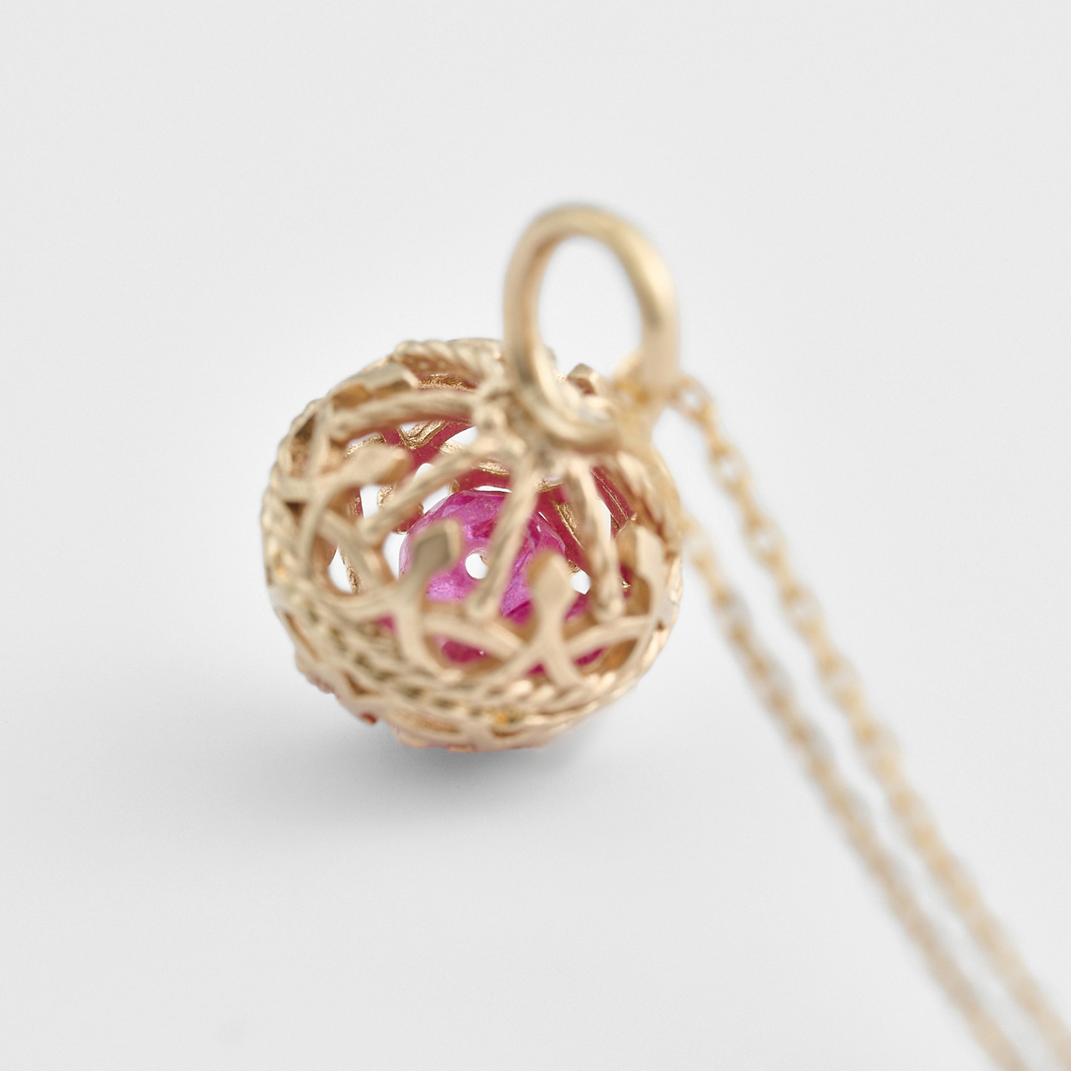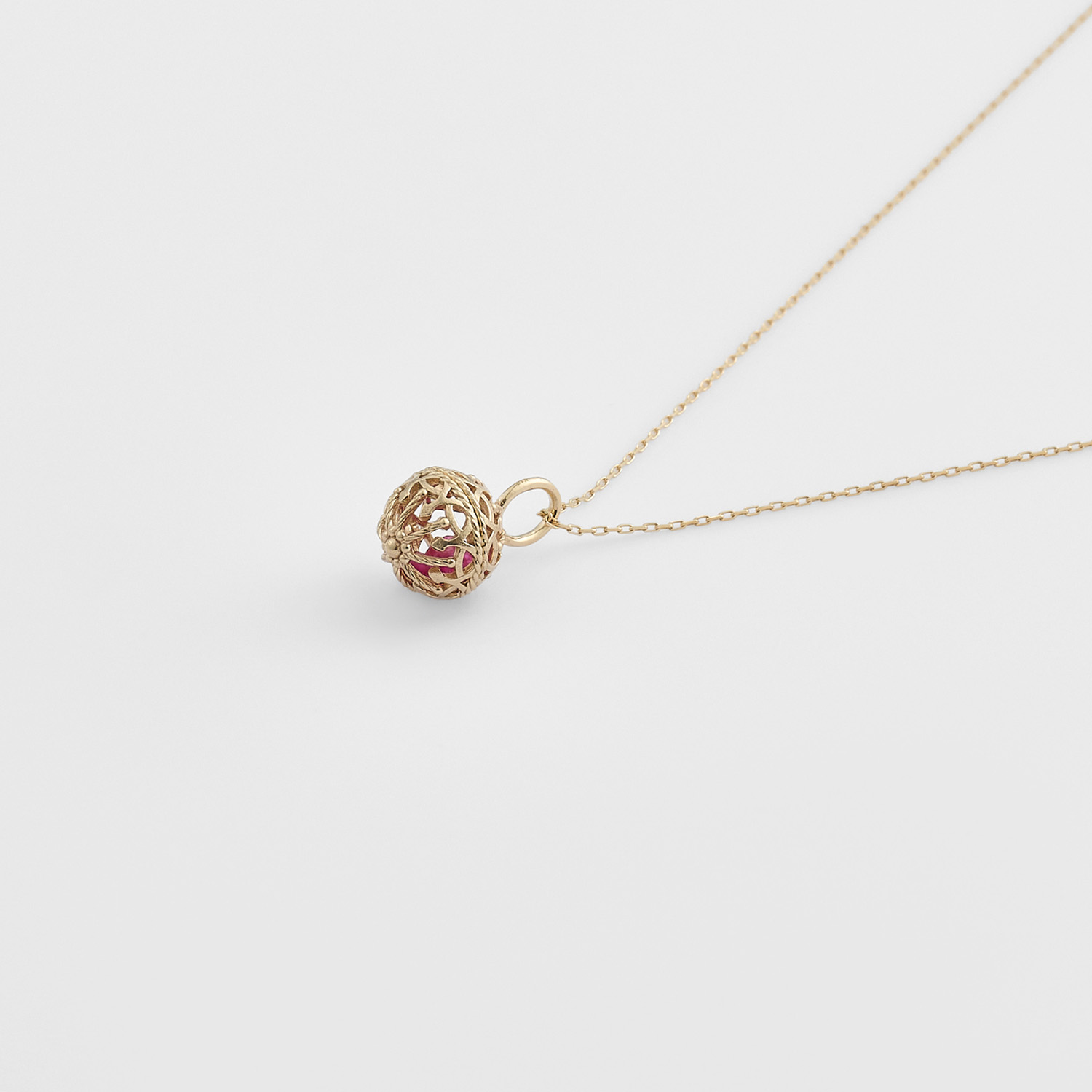 镂空雕刻的吊坠外框,内部点缀着红宝石,令人联想起饱满的石榴果实。